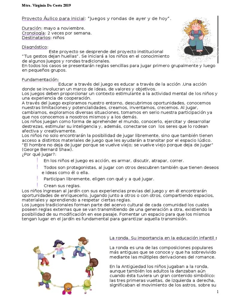 Conocer juegos tradicionales típicos de su comunidad. Conocer los juegos y las rondas del "cancionero europeo antiguo" que integra el folklore infantil de nuestro país y las canciones tradicionales de. Ofrecer experiencias de juego mediante los cuales los niños puedan conocerse a si mismos, a los demás y al mundo que los rodea. En una ronda infantil intervienen elementos como el juego, la danza, la recitación, la mímica, el canto, el diálogo, los juegos de palabras, etc . La mejor manera de compartir un juego con los niños es participar en los juegos como un jugador más, que se somete a las reglas como cualquier otro. Para iniciar, deben estar todos los niños en círculo, de pié y tomados de las manos.